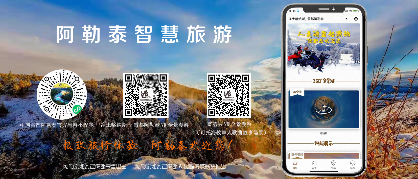 2020年年底,阿勒泰地委宣传部在“净土喀纳斯.雪都阿勒泰VR全景漫游”首次推出后,得到了社会的普遍认可和广泛关注,该VR作品是由阿勒泰地委宣传联合昆鹏文化传媒一同创作的,作品运用强大的科技数字媒体平台做后盾,开创了具有创新意义和高科技数字创新水平的高水准的数字媒体产品。给手机终端用户带来了很强的现实感体验和丰富的视觉享受。